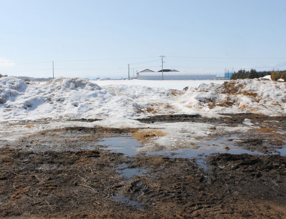 暖かな土曜日、雪どけが進みます。 牧場の南側の畑も、端っこは泥だらけになっています。 ここに足を踏み入れたら、タイヘン…! 畑一面に広がる雪がこれから数日のうちに全部とけてしまうのですから、太陽のエネルギーおそるべしです。 来週には市内で卒業式があり、お彼岸もすぐです♪