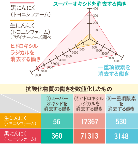 肌や体が老化していく原因には、左図①~③の物質が体を錆びつかせる(酸化させる)ことにあると考えられます。本来、人体にはこれらの過剰な発生を抑える「抗酸化活性力」が備わっていますが、その力は加齢とともに低下していくと言われています。若々しく、健康でいるためには重要な抗酸化活性力。そこで、トヨニシファームでは、熟成発酵によりポリフェノール類の含有量を増加させることで、にんにく中に含まれる抗酸化活性力を生にんにくの約10倍まで高めることに成功しました!