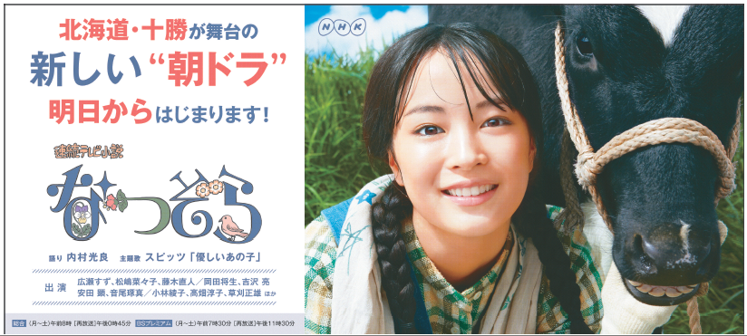 本日から始まった朝ドラの『なつぞら』は十勝が舞台です。地元の新聞にも大きな広告が掲載されていました。街中にもポスターが張られていたり、地元ではなつぞらで盛り上がっています。戦後直後の十勝の酪農がどんな風に描かれるのか楽しみにしています。十勝の美しい風景も沢山描かれると嬉しいですし。十勝の魅力が全国に伝わりますように♪
